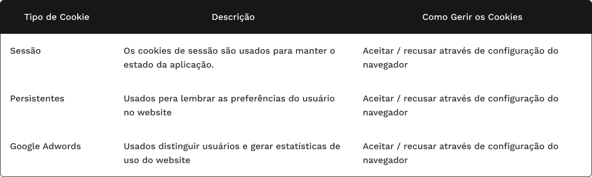 Abaixo uma descrição dos cookies utilizados em seus websites: