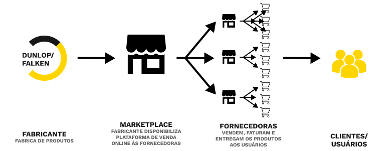 A Dunlop/Falken presta serviços de marketplace para a venda dos produtos por ela fabricados e adquiridos pelas Fornecedoras para revenda no mercado nacional. O Pedido de Compra, realizado pelo Usuário, é encaminhado para a respectiva Fornecedora, que será responsável pelo faturamento e envio do Produto: